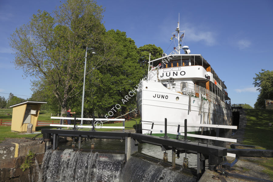 Ausflugsschiff, Bauwerk, Fahrzeug, Farbe, Götakanal, Juno, Kanal, Riksberg, Schiff, Schleuse, Schleusentor, Schweden, Töreboda, Verkehrsmittel, Västra Götlands län, Wasser, Wasserfahrzeug, blau, grün, weiß,