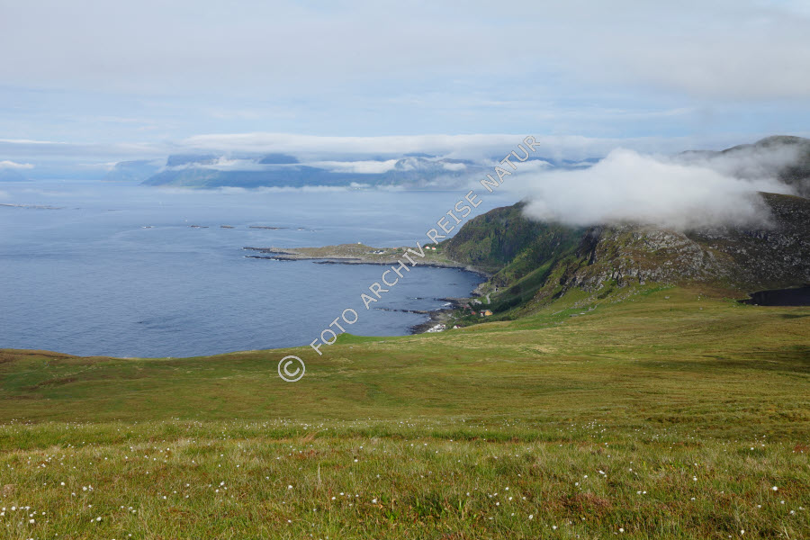 Berg, Berghang, Bergrücken, Flora, Gewässer, Goksøyr, Gras, Insel, Insel Runde, Kulturlandschaft, Landschaft, Meer, Møre og Romsdal, Nordmeer, Norwegen, Weide, Wiese, Wiesenhang,