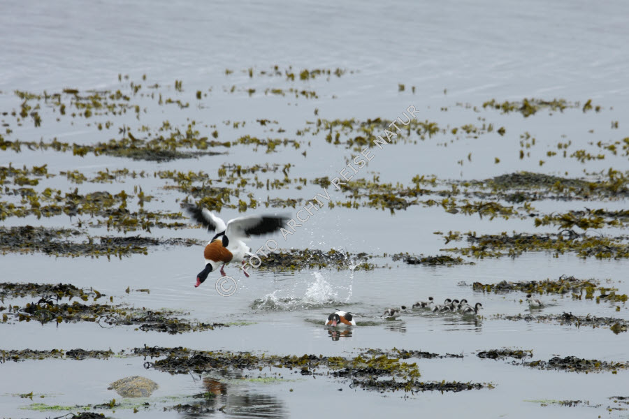 Keywords: Algen, Blasentang, Fucus vesiculosus, Brandgans, Tadorna tadorna, Entenvögel, Fauna, Flora, Gewässer, Insel, Insel Runde, Landschaft, Meer, Møre og Romsdal, Nordmeer, Norwegen, Seetang, Vogel,