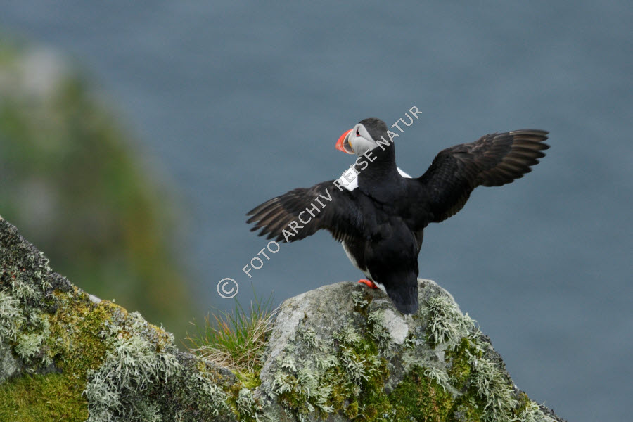 Keywords: Alkenvögel, Ereignis, Fauna, Felsbrocken, Felsen, Flattern, Geschehen, Goksøyr, Insel, Insel Runde, Landschaft, Material, Møre og Romsdal, Norwegen, Papageitaucher, Fratercula arctica, Stein, Tätigkeit, Vogel,