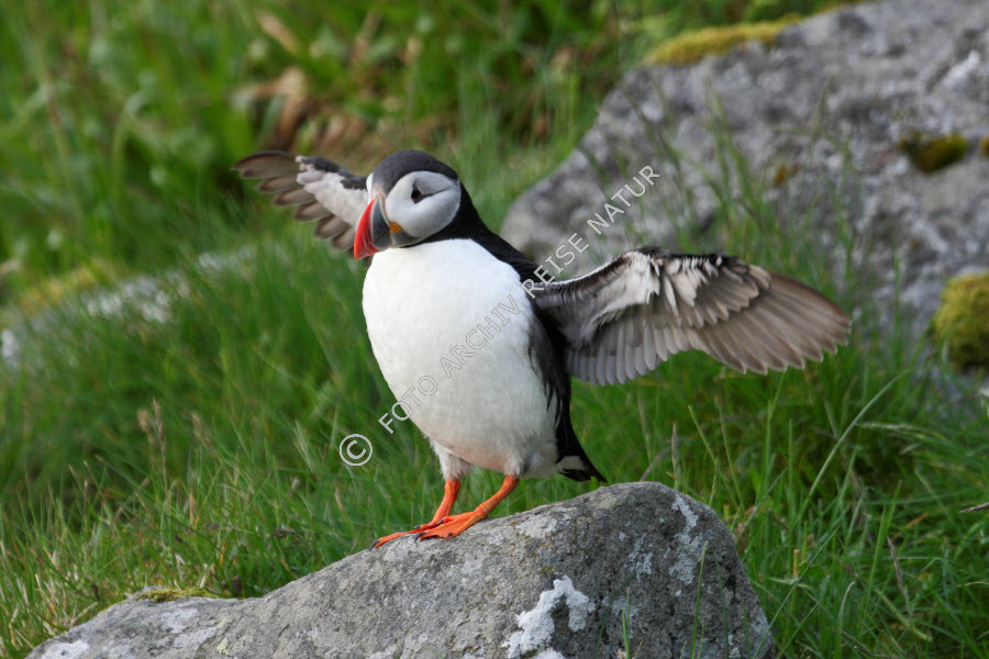 Keywords: Alkenvögel, Fauna, Felsbrocken, Felsen, Felshang, Flora, Geröll, Geröllfeld, Goksøyr, Gras, Grasbüschel, Insel, Insel Runde, Landschaft, Material, Møre og Romsdal, Norwegen, Papageitaucher, Fratercula arctica, Stein, Vogel, Wiese, Wiesenhang,