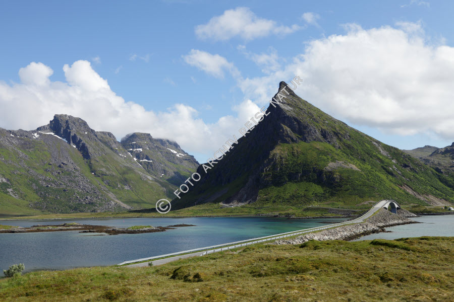 Keywords: Bauwerk, Berg, Bergkette, Bergspitze, Bogenbrücke, Brücke, Fjord, Fredvang, Gebirge, Gewässer, Gipfel, Kulturlandschaft, Landschaft, Lofoten, Moskenesøy, Nordland, Norwegen, Straße, Straßendamm, Verkehrsweg, Wiese,