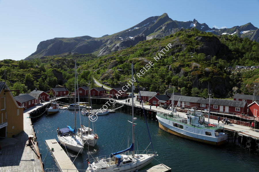 Bauwerk, Berg, Berghang, Bergspitze, Fischereihafen, Fischerhütte, Flakstadøy, Gebäude, Hafen, Haus, Holzhaus, Hütte, Lagerhaus, Landschaft, Lofoten, Mole, Nordland, Norwegen, Nusfjord, Pfahlbau, Rorbu, Schiffsanleger, Speicher, Wald,