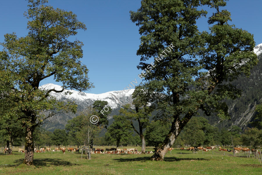 Ahorngewächse, Alm, Baum, Bergahorn, Acer pseudoplatanus, Engalm, Fauna, Flora, Gebirge, Großer Ahornboden, Hinterriss, Hochtal, Huftier, Karwendel, Kuh, Kulturlandschaft, Landschaft, Rind, Säugetier, Tal, Tirol, Vomp, Weide, Österreich,