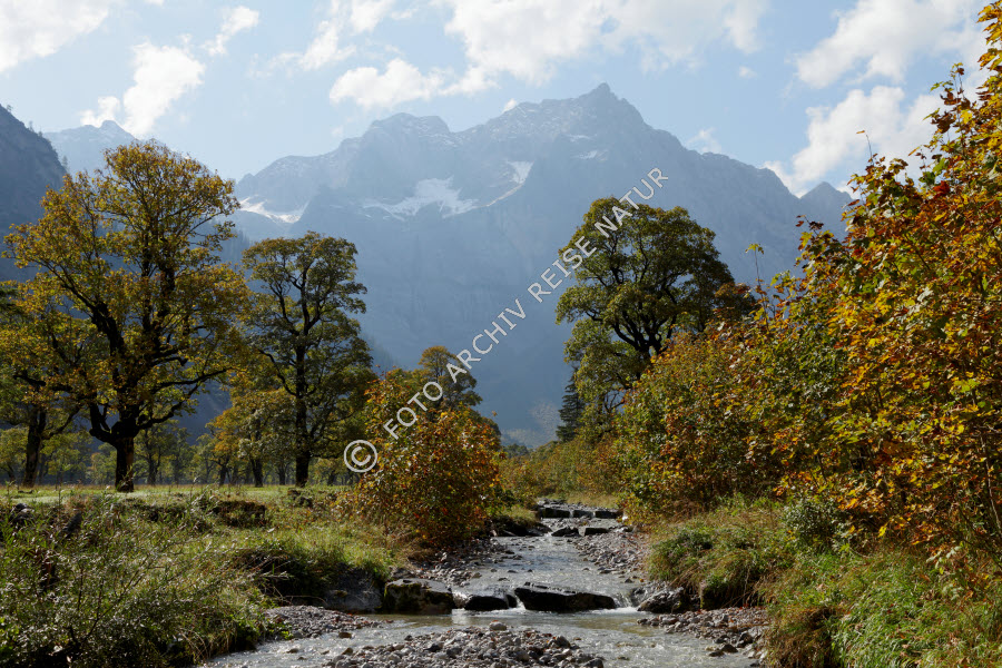 Ahorngewächse, Alm, Bach, Baum, Bergahorn, Acer pseudoplatanus, Bergwald, Engalm, Flora, Gebirge, Gebirgsbach, Gewässer, Großer Ahornboden, Hinterriss, Hochtal, Karwendel, Kulturlandschaft, Landschaft, Tal, Tirol, Vomp, Wald, Weide, Österreich,