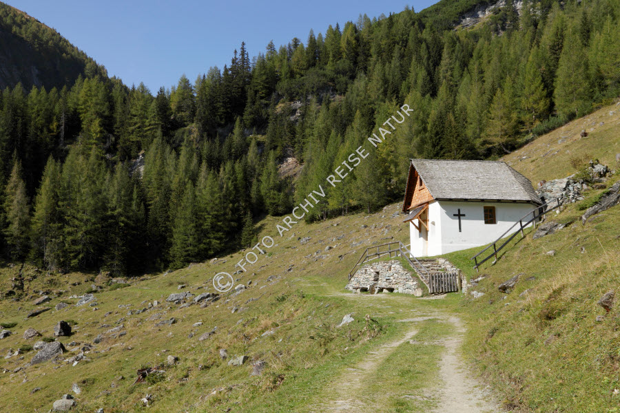 Alm, Bauwerk, Bergwald, Dach, Fahrweg, Felsbrocken, Felsen, Gebäude, Gebäudeteil, Heiligenblut, Kapelle, Kulturlandschaft, Kärnten, Landschaft, Material, Sakralbau, Schindeldach, Stein, Verkehrsweg, Wald, Wanderweg, Weg, Weide, Winkel, Österreich,