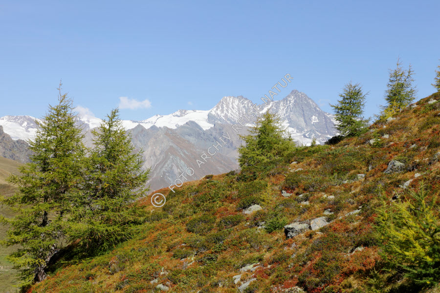 Keywords: Baum, Berg, Bergkette, Bergwald, Blaubeere, Vaccinium myrtillus, Cimaross, Farbe, Flora, Gebirge, Großglockner, Heidekrautgewächs, Hohe Tauern, Kals am Großglockner, Kieferngewächs, Landschaft, Lärche, Larix, Nadelwald, Nationalpark, Ort, Tirol, Wald, bunt, Österreich,