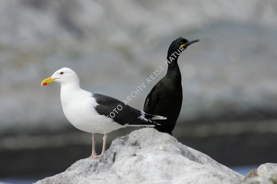 Barentssee, Farbe, Fauna, Felsen, Finnmark, Gewässer, Hornøya, Insel, Kormorane, Krähenscharbe, Phalacrocorax aristotelis, Landschaft, Lappland, Mantelmöwe, Larus marinus, Material, Meer, Möwen, Norwegen, Stein, Varanger, Vardø, Vogel, Vogelfelsen, Vogelinsel, schwarz, weiß,