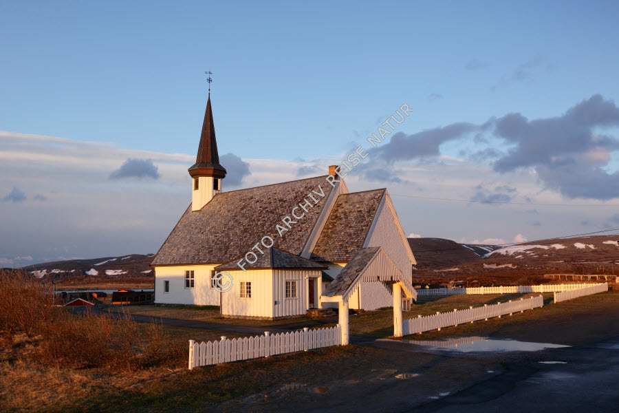 Bauwerk, Berlevåg, Einfriedung, Finnmark, Gebäude, Gebäudeteil, Glockenturm, Holzkirche, Holzzaun, Kirche, Kirchturm, Lappland, Lattenzaun, Mitternachtssonne, Norwegen, Sakralbau, Sonne, Tor, Turm, Varanger, Wetter, Klima, Zaun,