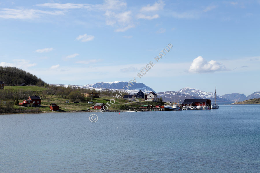 Bauwerk, Berg, Bergrücken, Dorf, Finnmark, Fischerdorf, Fischereihafen, Gewässer, Hafen, Kulturlandschaft, Landschaft, Lappland, Meer, Mole, Neverfjord, Nordmeer, Norwegen,