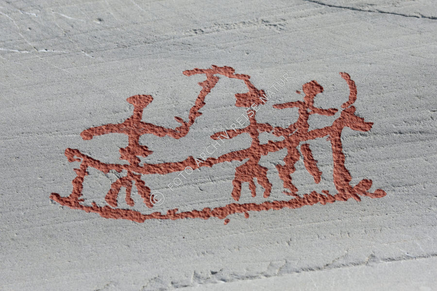 Felsritzung in Alta, Boot mit Elchkopf und drei Menschen