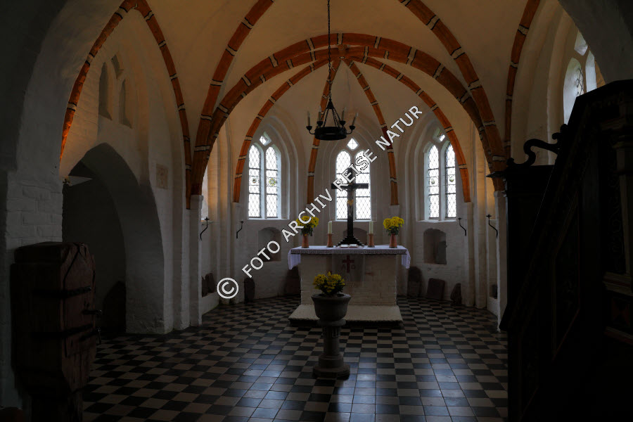 Altar, Bauwerk, Chor- Altarraum, Deutschland, Gebäude, Gebäudeteil, Gewölbe, Groß Zicker, Kirche, Kirchenschiff, Kreuzgewölbe, Mecklenburg-Vorpommern, Rügen, Sakralbau,