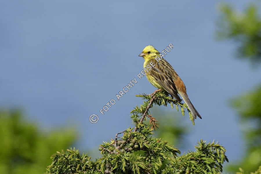 Keywords: Ammern, Baum, Fauna, Flora, Goldammer, Emberiza citrinella, Kivik, Nationalpark, Ort, Schweden, Skåne, Stenshuvud, Vogel, Wacholder Juniperus, Zypressengewächs,