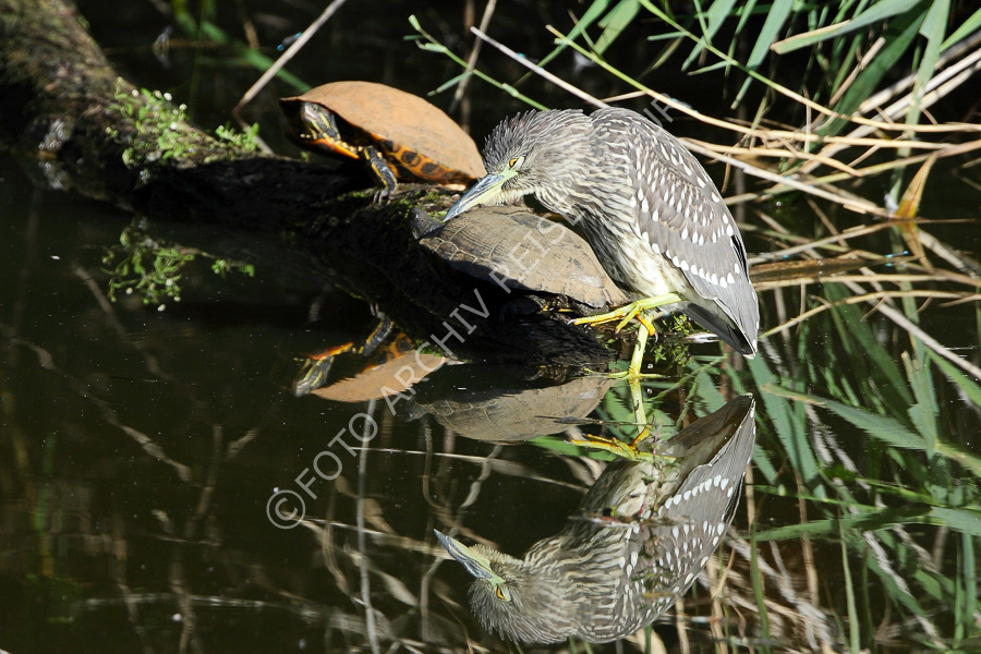 Junger Nachtreiher und Europäische Sumpfschildkröte