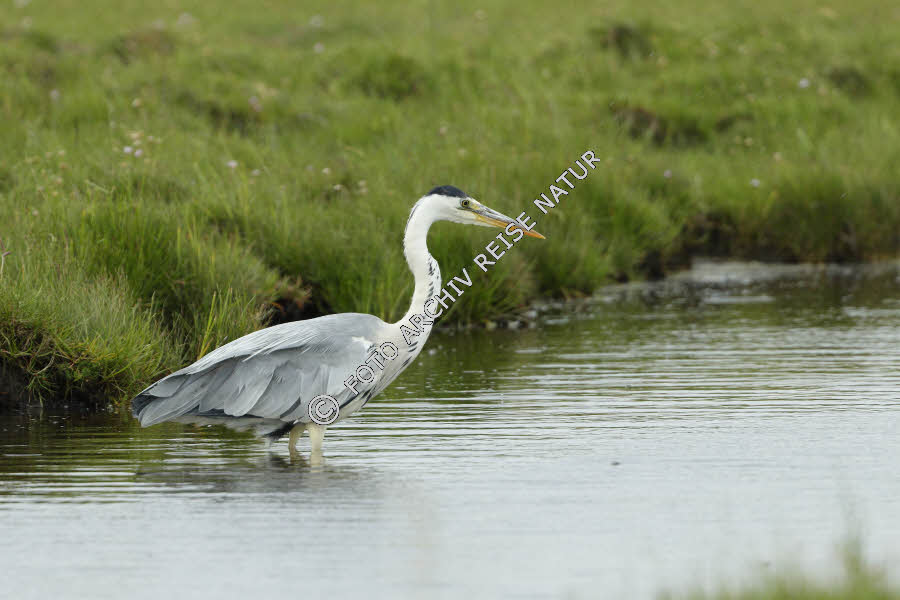 Ereignis, Fangen, Fauna, Fischen, Futtersuche, Geschehen, Gewässer, Graureiher, Ardea cinera, Landschaft, Priel, Reiher, Strandwiese, Suche, Tätigkeit, Vogel, Wiese,