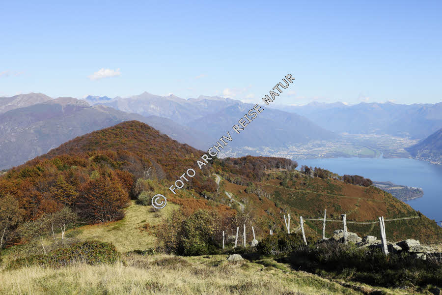 Baum, Bauwerk, Berg, Berghang, Bergrücken, Bergwald, Buche, Fagus, Buchengewächs, Buchenwald, Einfriedung, Farbe, Flora, Gewässer, Lago Maggiore, Landschaft, Laubwald, Pfad, See, Verkehrsweg, Wald, Wanderweg, Weg, Weidezaun, Zaun, bunt,