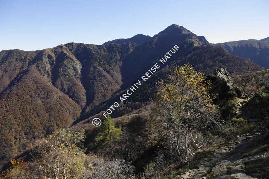 Keywords: Bauwerk, Berg, Berghang, Bergkette, Bergpfad, Bergwald, Birkenwald, Farbe, Gebirge, Gipfel, Landschaft, Laubwald, Pfad, Tamaro, Verkehrsweg, Wald, Wanderweg, Weg, bunt,