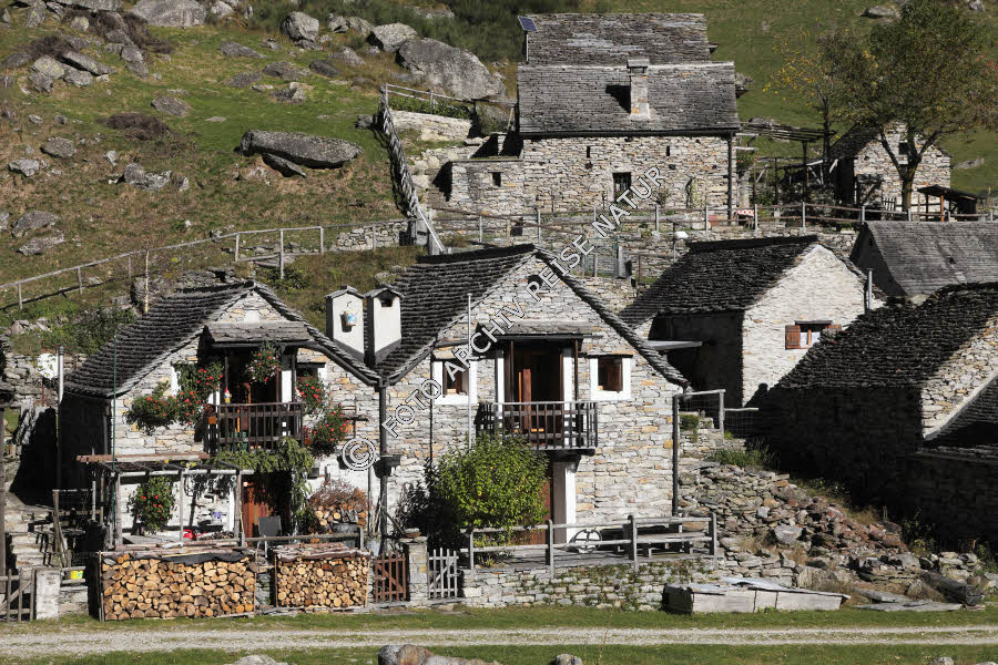 Keywords: Bauwerk, Bergdorf, Berghütte, Bergwald, Dach, Dorf, Gebäude, Gebäudeteil, Gehöft, Granitdach, Granitmauer, Haus, Hochtal, Hof, Hütte, Kulturlandschaft, Landschaft, Mauer, Natursteindach, Natursteinhaus, Natursteinmauer, Rustico, Tal, Wald, Weiler,