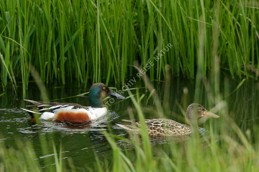Keywords: Entenvögel, Fauna, Gruppe, Grüner Brink, Landschaft, Löffelente, Anas clypeata, Naturschutzgebiet, Ort, Paar, Pärchen, Schilfgürtel, Vogel,