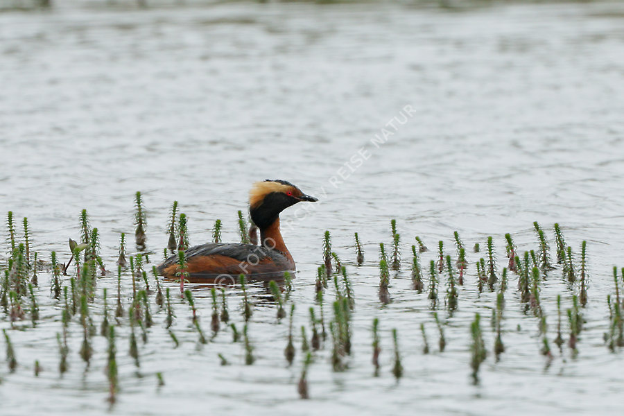 Austvågøya, Fauna, Fjord, Flora, Gewässer, Landschaft, Lappentaucher, Lofoten, Nordland, Norwegen, Ohrentaucher, Podiceps auritus, Schachtelhalmgewächs, Straumnes, Teich-Schachtelhalm, Equisetum fluviatile, Vatnfjorden, Vogel,