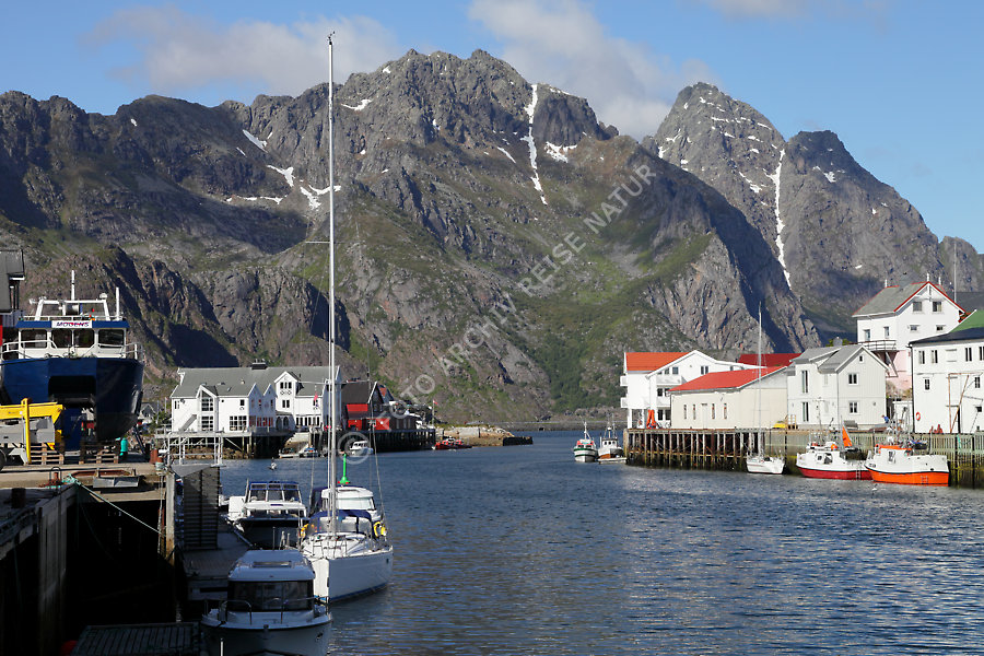 Austvågøya, Bauwerk, Bergmassiv, Dorf, Fischerdorf, Fischereihafen, Gebirge, Hafen, Henningsvær, Kulturlandschaft, Landschaft, Lofoten, Nordland, Norwegen, Pfahlbau,