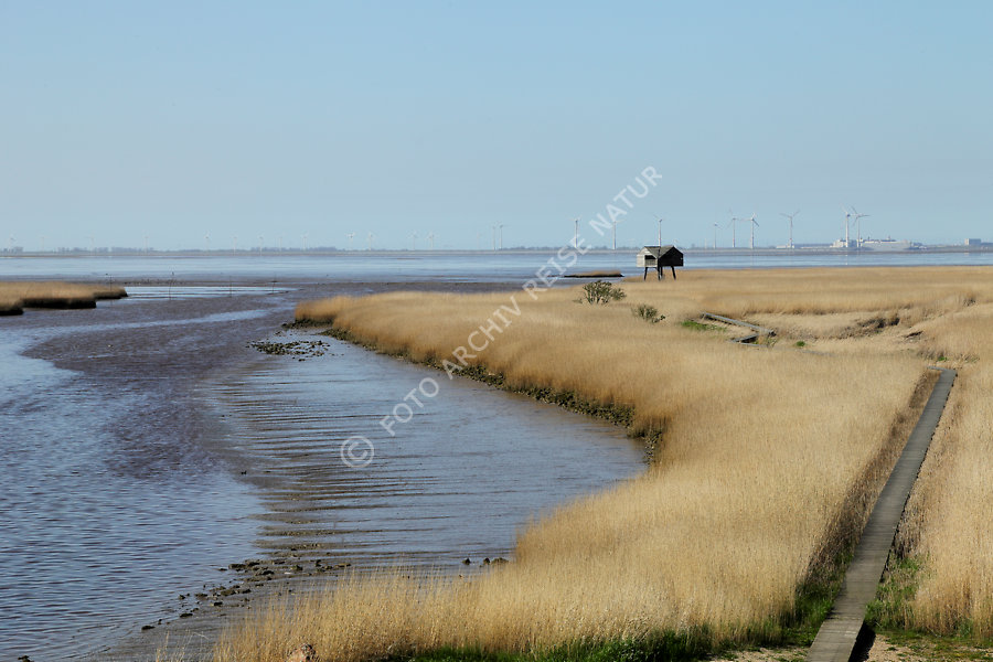 Keywords: Bauwerk, Beobachtungsturm, Bohlensteg, Dollart, Flora, Gewässer, Gras, Holzsteg, Küste, Landschaft, Meer, Niederlande, Nieuwe Statenzijl, Nordsee, Pfad, Reet, Schilfrohr , Phragmites australis, Schlick, Steg, Süßgras, Turm, Verkehrsweg, Vogelturm, Wanderweg, Watt, Weg, Windrad,