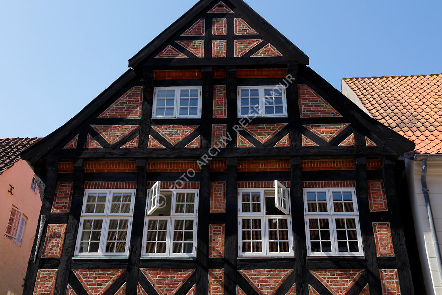 Altstadt, Bauwerk, Dach, Dänemark, Fachwerk, Fenster, Gebäudeteil, Giebel, Jütland, Kultur, Kulturlandschaft, Mauer, Ribe, Sprossenfenster, Stadt, Staffelgiebel, Ziegelgefach, historisch,