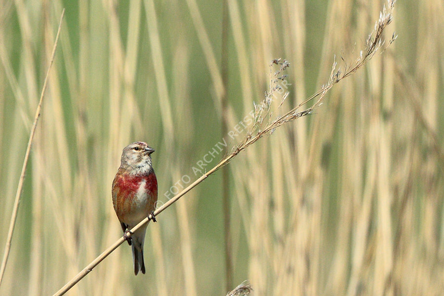 Keywords: Bluthänfling, Carduelis cannabina, Deutschland, Fauna, Finken, Flora, Gras, Krummhörn, Niedersachsen, Ostfriesland, Reet, Schilfrohr , Phragmites australis, Süßgras, Upleward, Vogel,