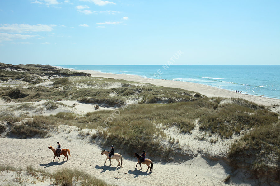 Nehrung Holmsland Klit, Aktivität, Dänemark, Ereignis, Fauna, Flora, Freizeit, Freizeitsportler, Gras, Huftier, Jütland, Person, Pferd, Reiten, Sportler, Strandhafer, Ammóphila, Säugetier, Süßgras,