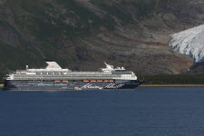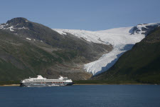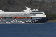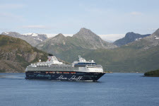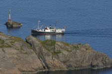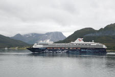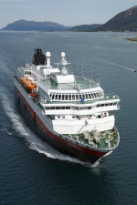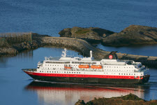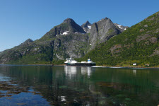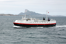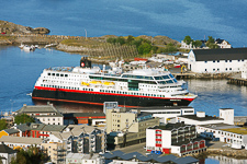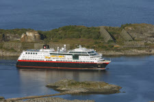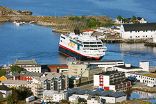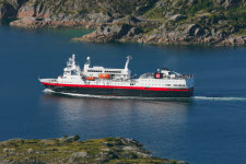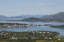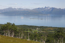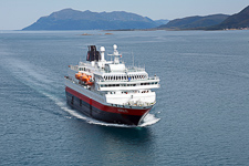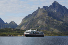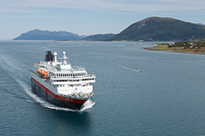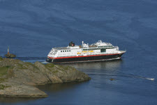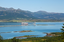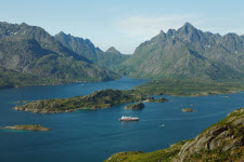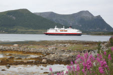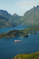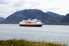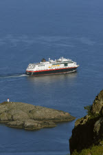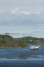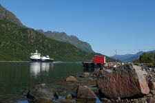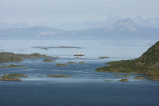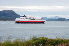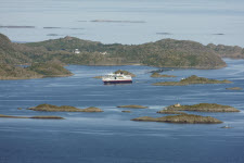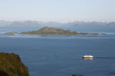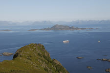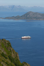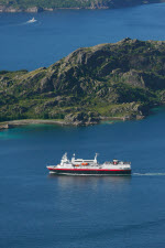 Sicht vom Digermulkollen auf ein Hurtigrutenschiff bei der Einfahrt in den Ulvågsund